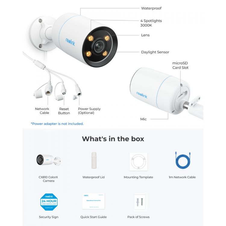 Reolink CX810 tuo kameroihin uuden sukupolven ColorX-yönäön. Kameran yökuva näkyy kuin päivällä. Kameran linssi taltio valoa jopa neljä kertaa enemmän kuin tavallinen valvontakameran linssi. Kameran 3000K säädettävän lämpimän valon kirkkautta voi lisätä asteittain. Tämä auttaa vähentämään mahdollista valosaastetta ja naapureille aiheutuvaa häiriöitä. Samaan aikaan valo auttaa kameraa ottamaan upeita täysvärikuvia yöaikaan erittäin heikossakin valaistuksessa. Kamerassa on älykäs liiketunnistus. Liiketunnistus osaa erottaa onko liikkuva kohde ihminen, ajoneuvo, eläin tai muu. Reolink CX810 on kahdeksan megapikselin (3840x2160), Ultra HD tarkkuudella tallentava PoE-valvontakamera.