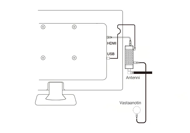 DigiTikun asennus on erittäin yksinkertaista: liitä laite televisioon pakkauksen mukana tulevalla HDMI-kaapelilla ja yhdistä virtajohto DC-liitäntään. Virtajohto voidaan kytkeä helposti suoraan television tai näytön USB-porttiin. Kiinnitä DigiTikkuun myös IR-vastaanotin, joka mahdollistaa kaukosäätimen käytön, vaikka digiboksi olisi piilotettuna esimerkiksi television taakse.