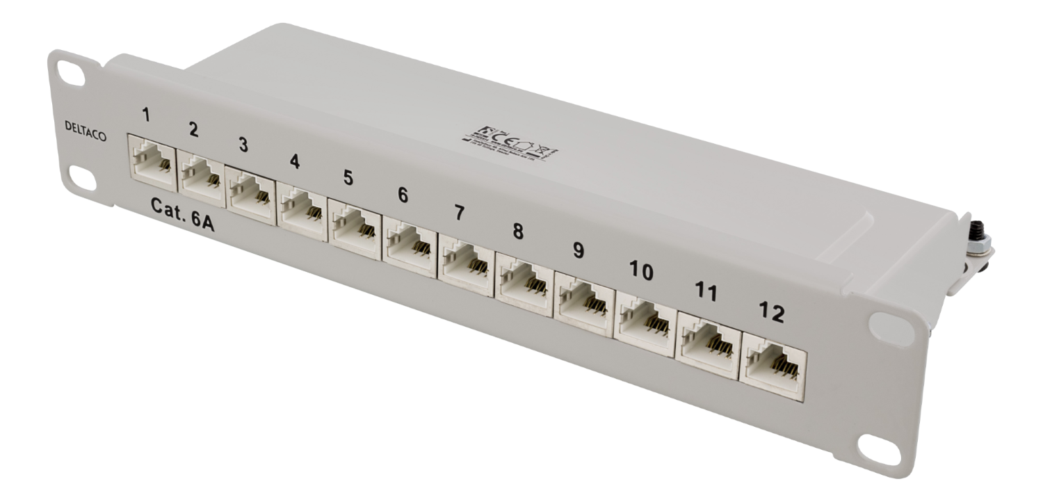 Suojattu kytkentäpaneeli, joka soveltuu 10 tuuman räkkiasennukseen. Tässä mallissa on 12 RJ45-porttia. Takaosassa on kiinni ruuvattava peitelevy, joka suojaa kaapeleita ja Krone-rimoja. Kaapelit on mahdollista kiinnittää paneeliin ruuveilla, jos haluaa varmistaa niiden pysymisen paikallaan.
